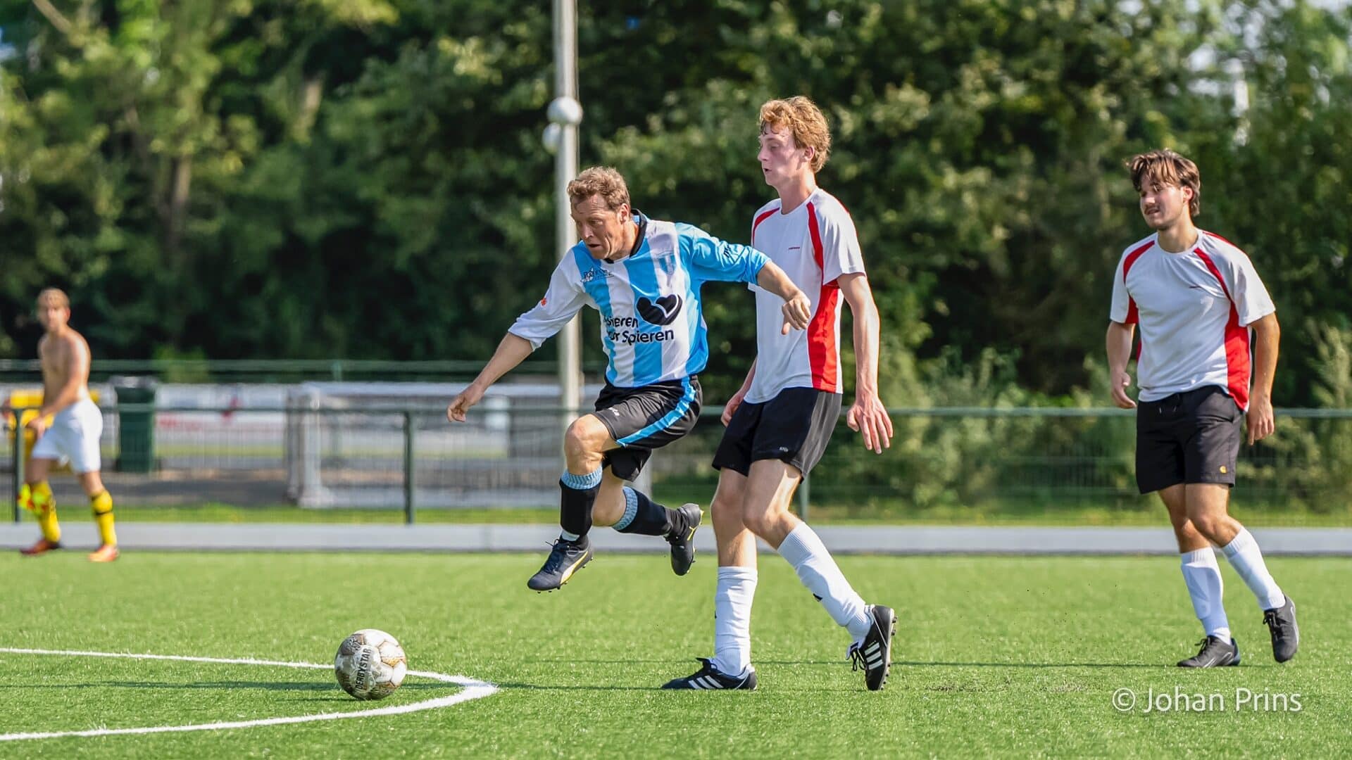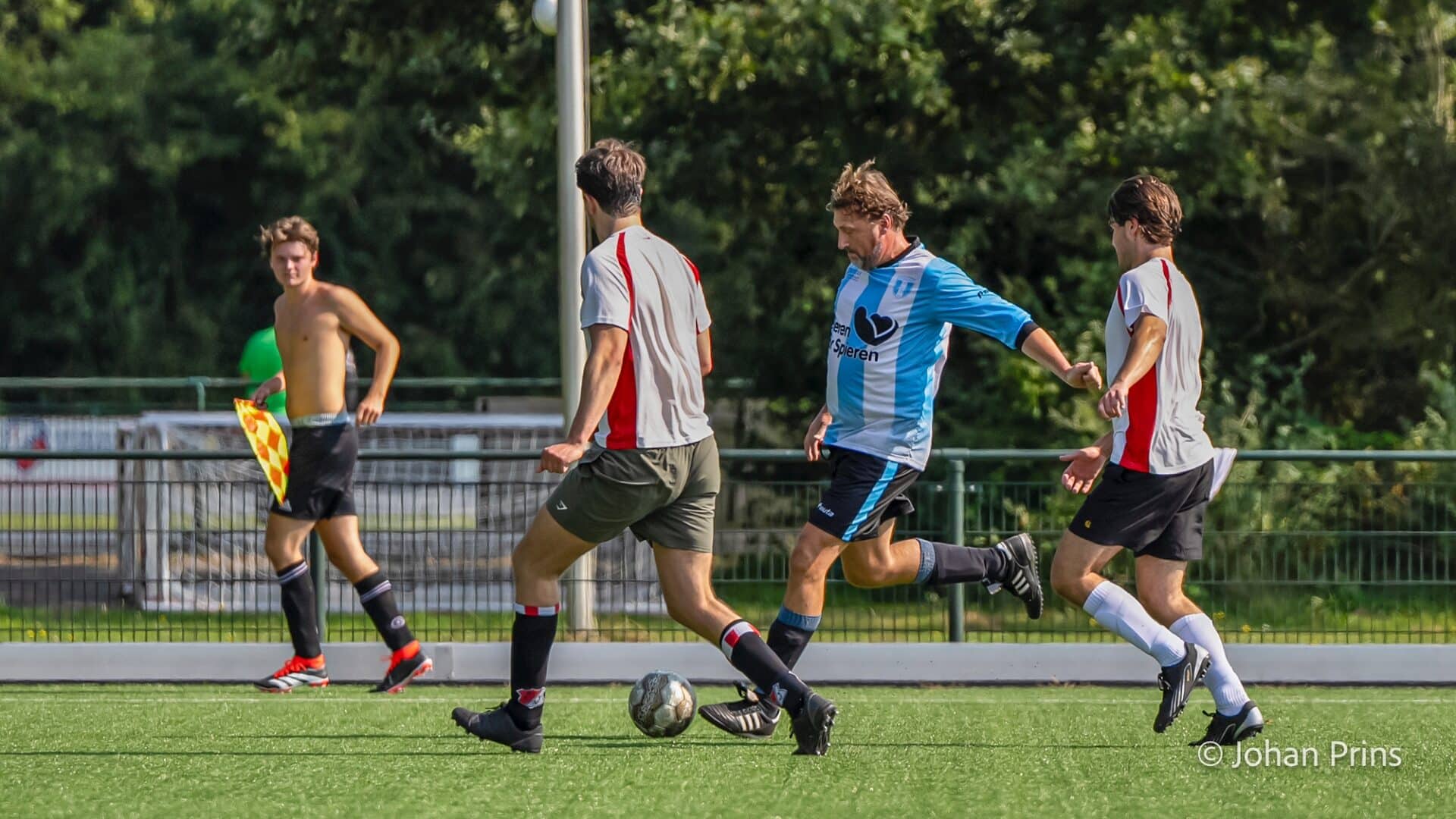 Arjan en Martijn konden eveneens een prima eerste helft bijschrijven. Zij waren verantwoordelijk voor de diepgang op rechts, afwisselend met Kevin. Laatstgenoemde scoorde op aangeven van Lambert de 3-0. Onze garagist was er ook als de kippen bij om een foutief terugspeelballetje te onderscheppen (4-0), en tekende voor de assist op de einduitslag (5-1), een klinische schuiver van Aad.